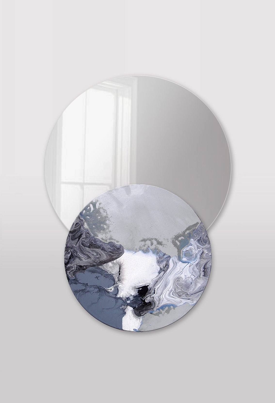 Two round surfaces overlap and the contrasting materials are set in dialogue. Each mirror-object is produced with a unique pattern. These artworks are about the beauty of detailed organic imperfection, provoking the spectator to engage in a material realtionship in the moment of their encounter in form of a simple touch. It is the visbile result of the creative process of its production, framed in a still moment.