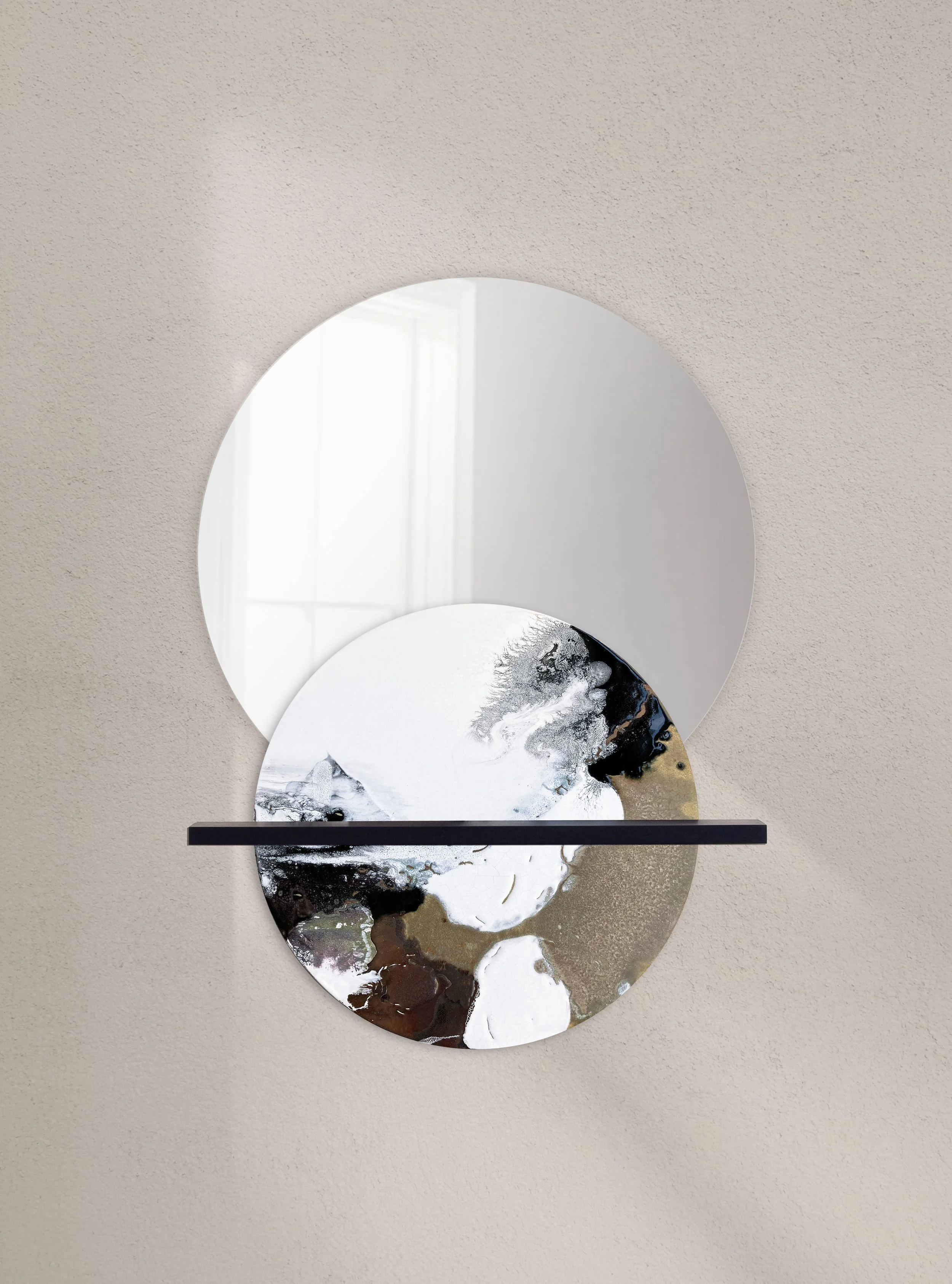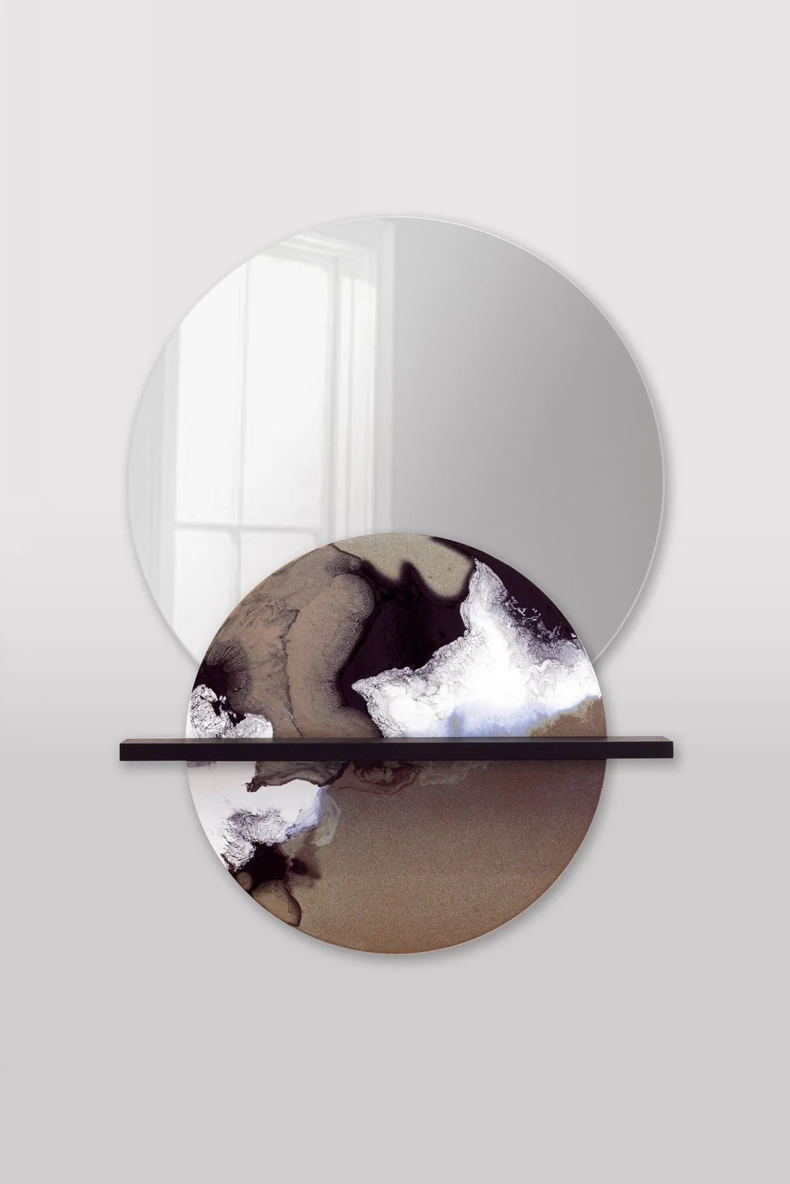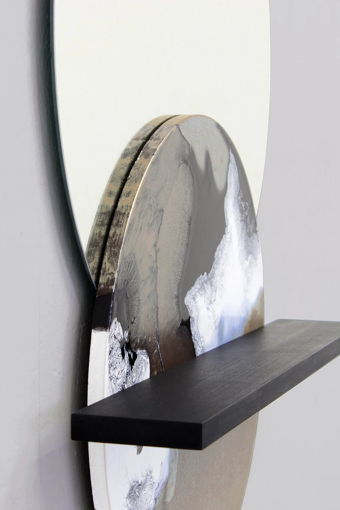 For the Collection of Mirrors cermic- surfaces merge with functional surfaces, mirrors and wooden shelves. Two round surfaces overlap and the contrasting materials are set in dialogue. Each mirror-object is produced with a unique pattern.