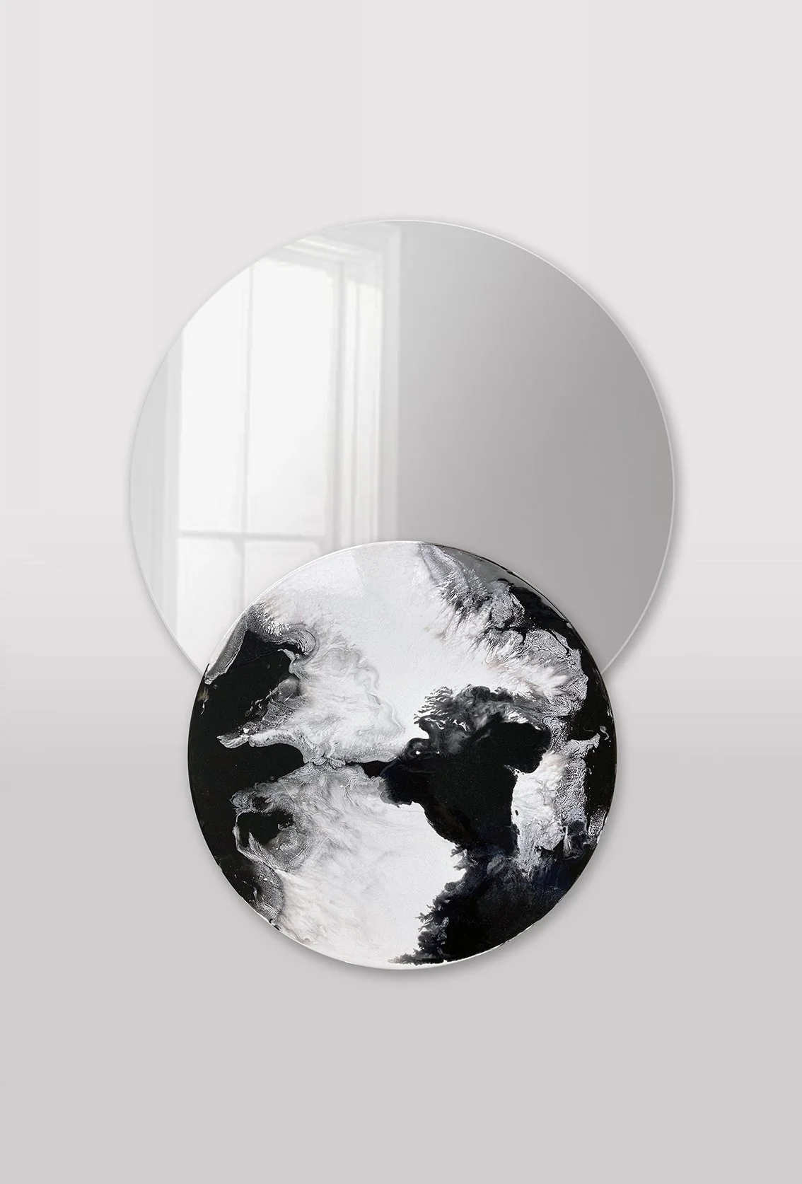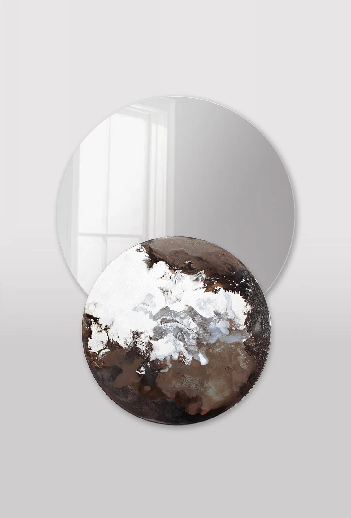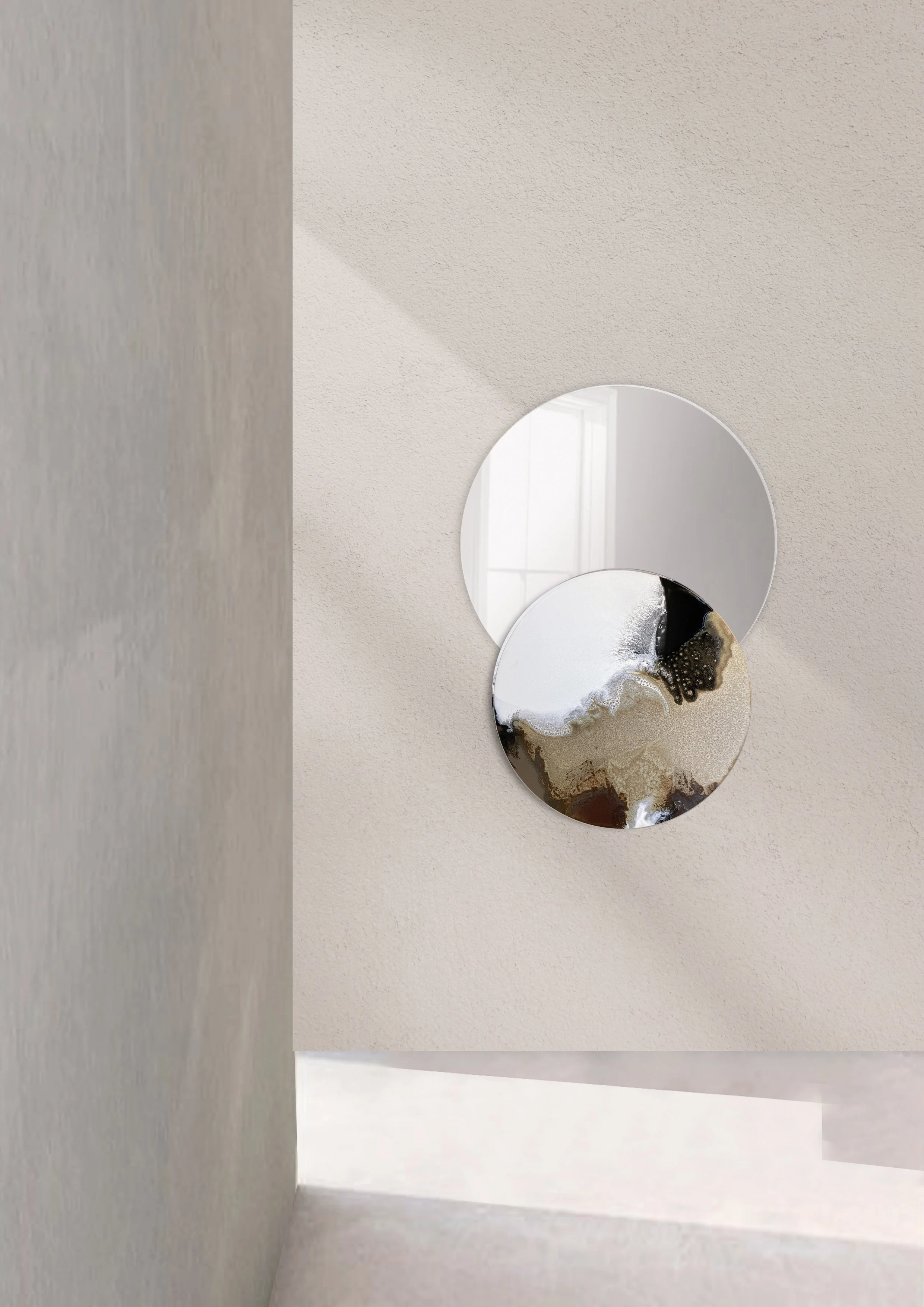 For the Collection of Mirrors cermic- surfaces merge with functional surfaces, mirrors and wooden shelves. Two round surfaces overlap and the contrasting materials are set in dialogue. Each mirror-object is produced with a unique pattern.