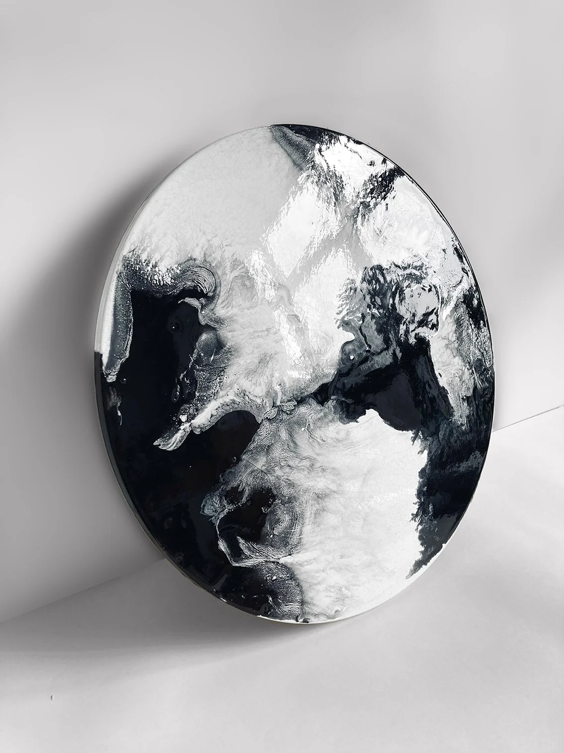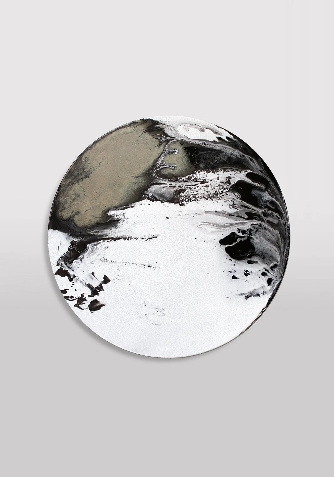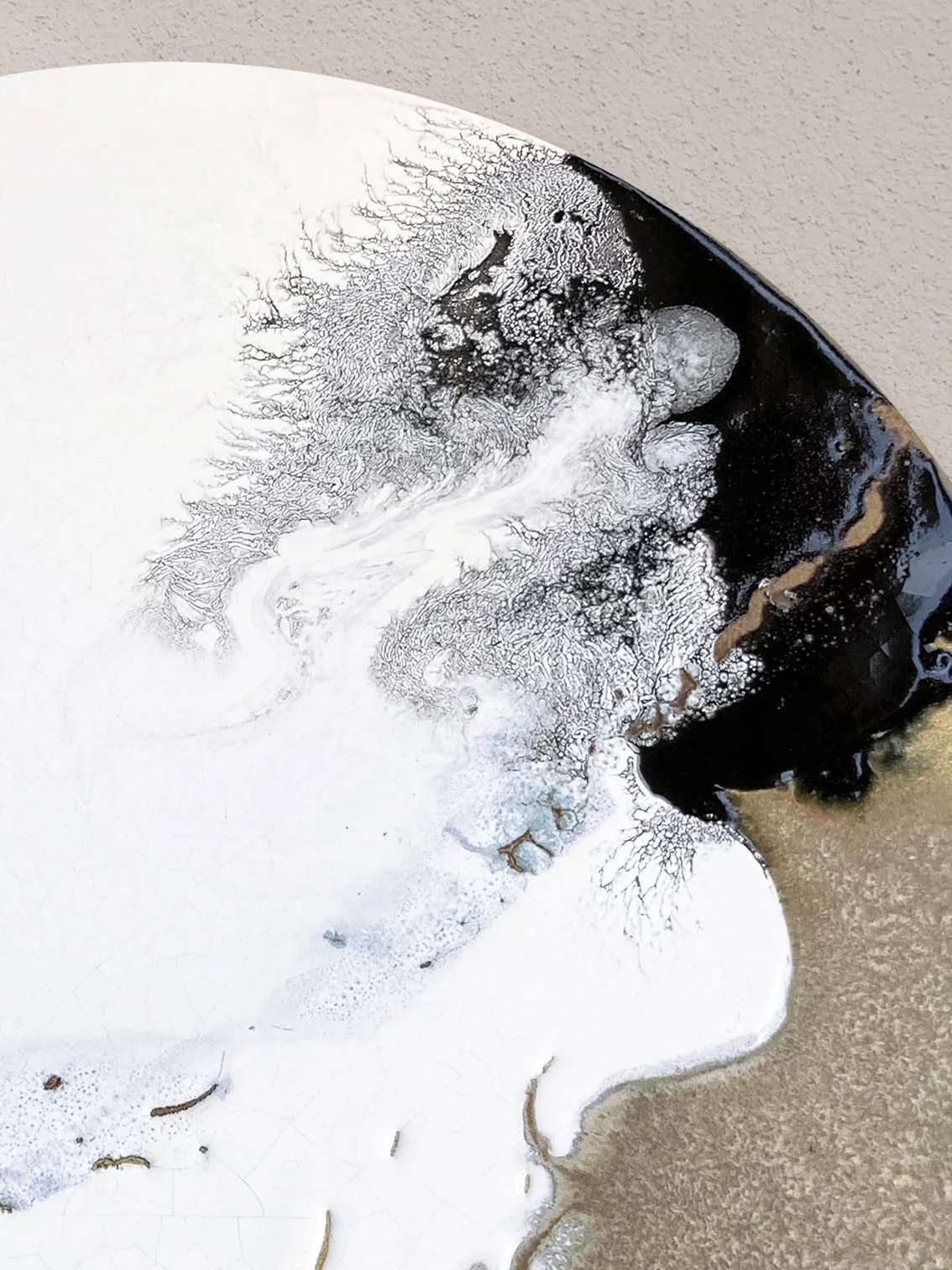 Liquid glazes pool and mix together under the influence of rotation and blown air to leave traces of fluid movement and smoke-like patterns which are solidified in the heat of the kiln. The finished surfaces show traces of gravitiy, colours flow and collide.