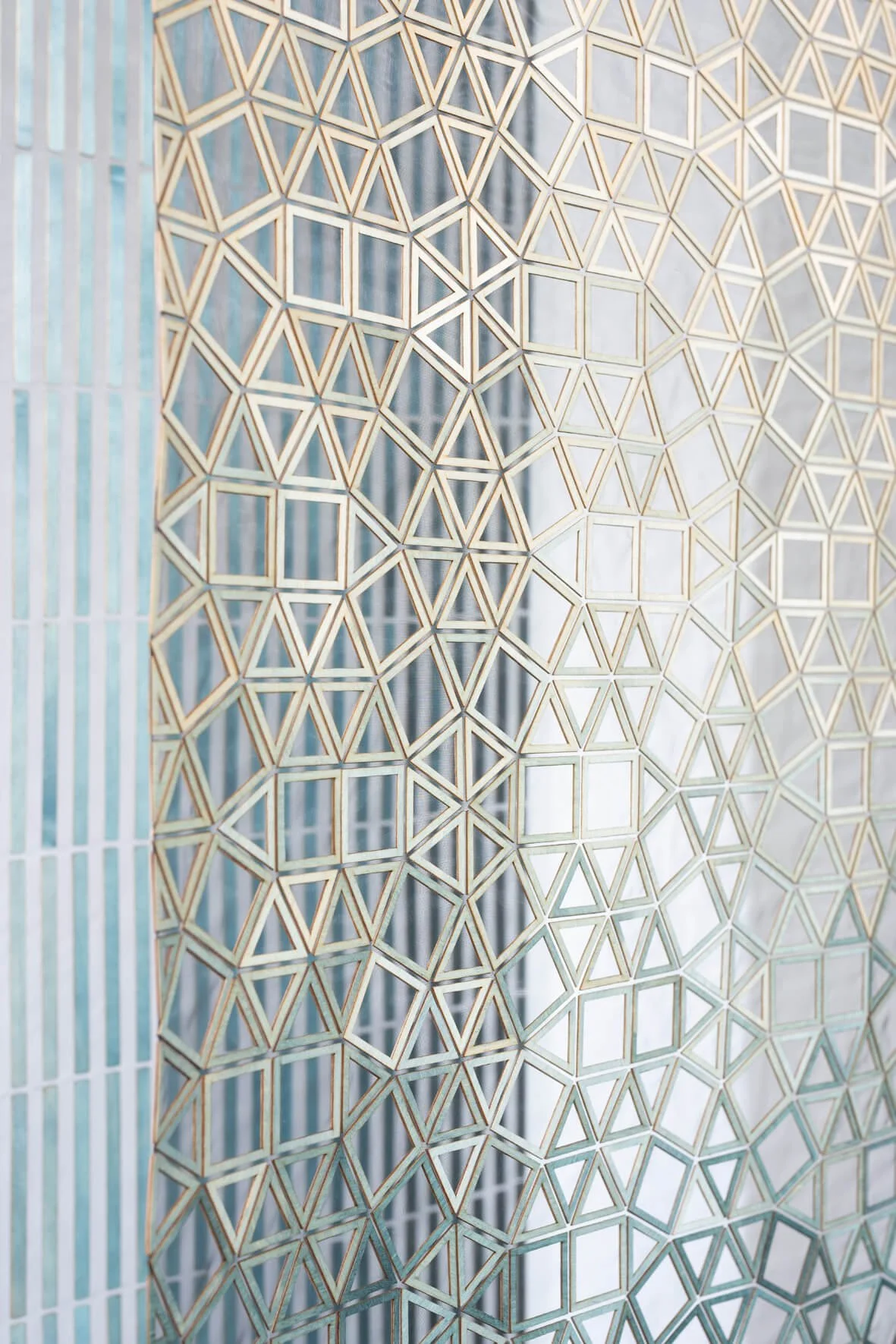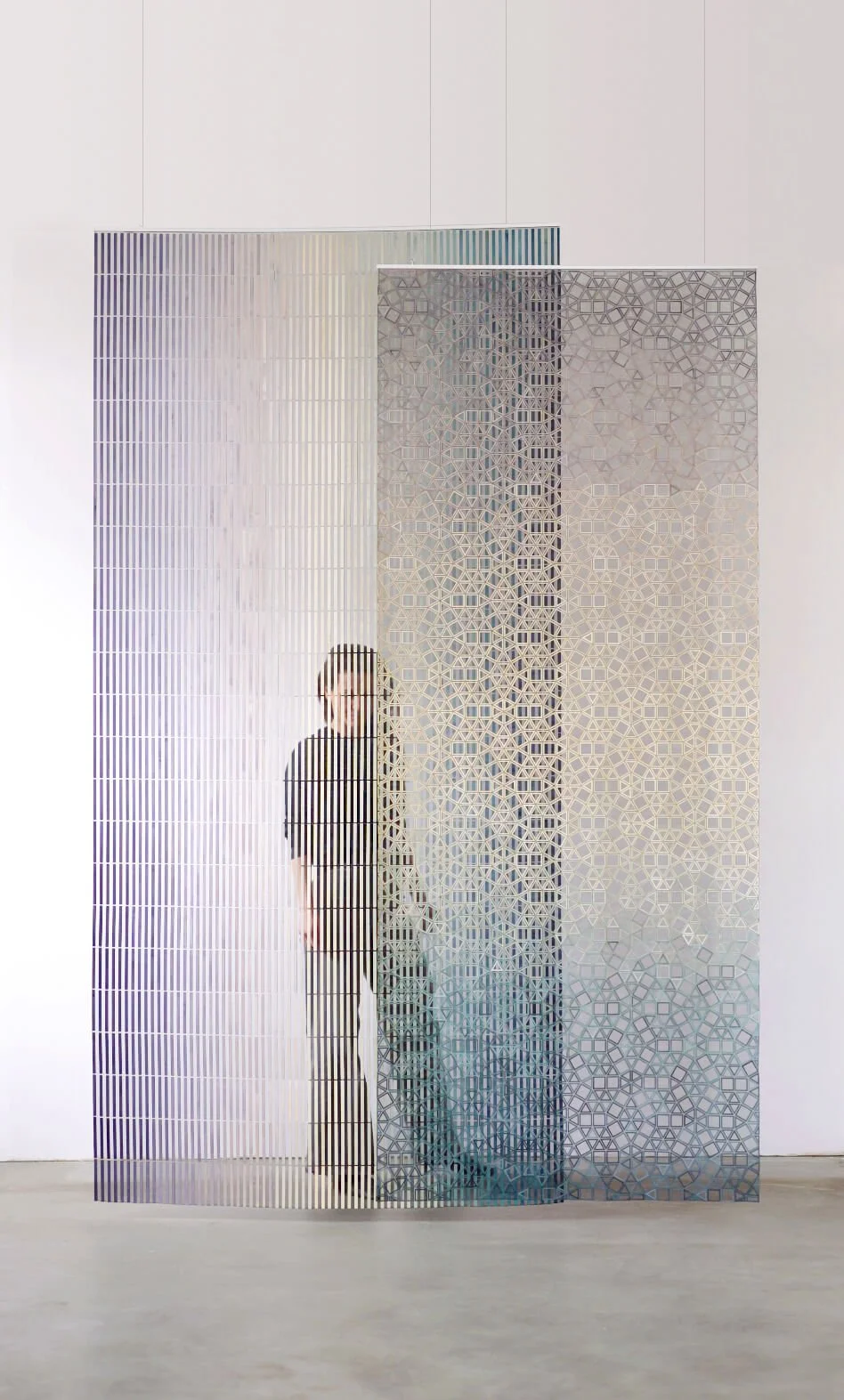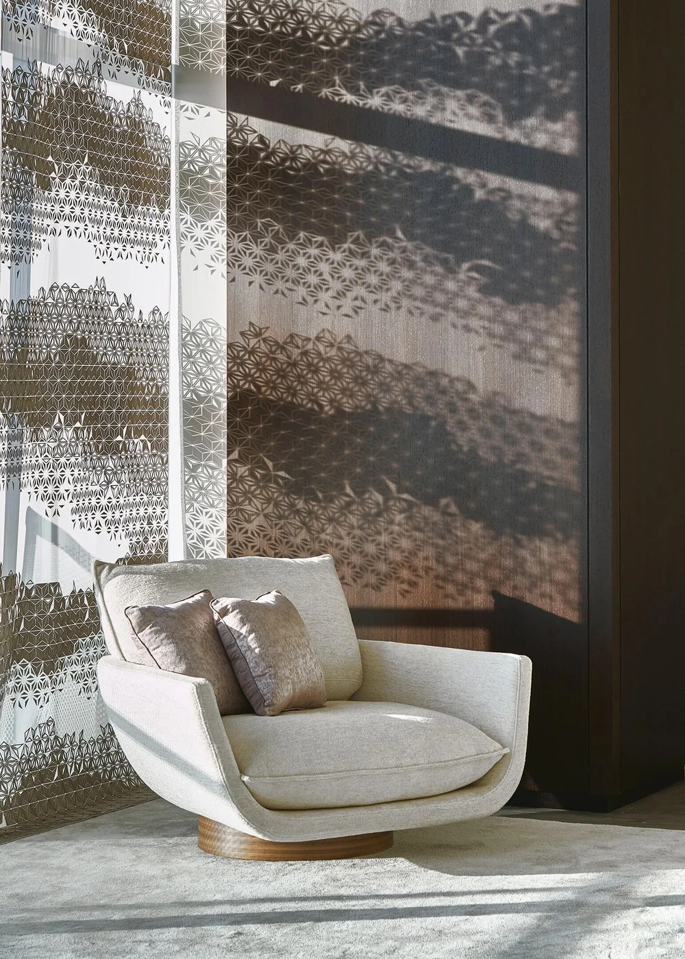 The flexible hybrid material “Wooden Textile” has been developed by Elisa Strozyk in 2009 using an innovative technique to merge wood and textile. Each wooden triangle is placed by hand on the textile base material to create floating solid patterns.