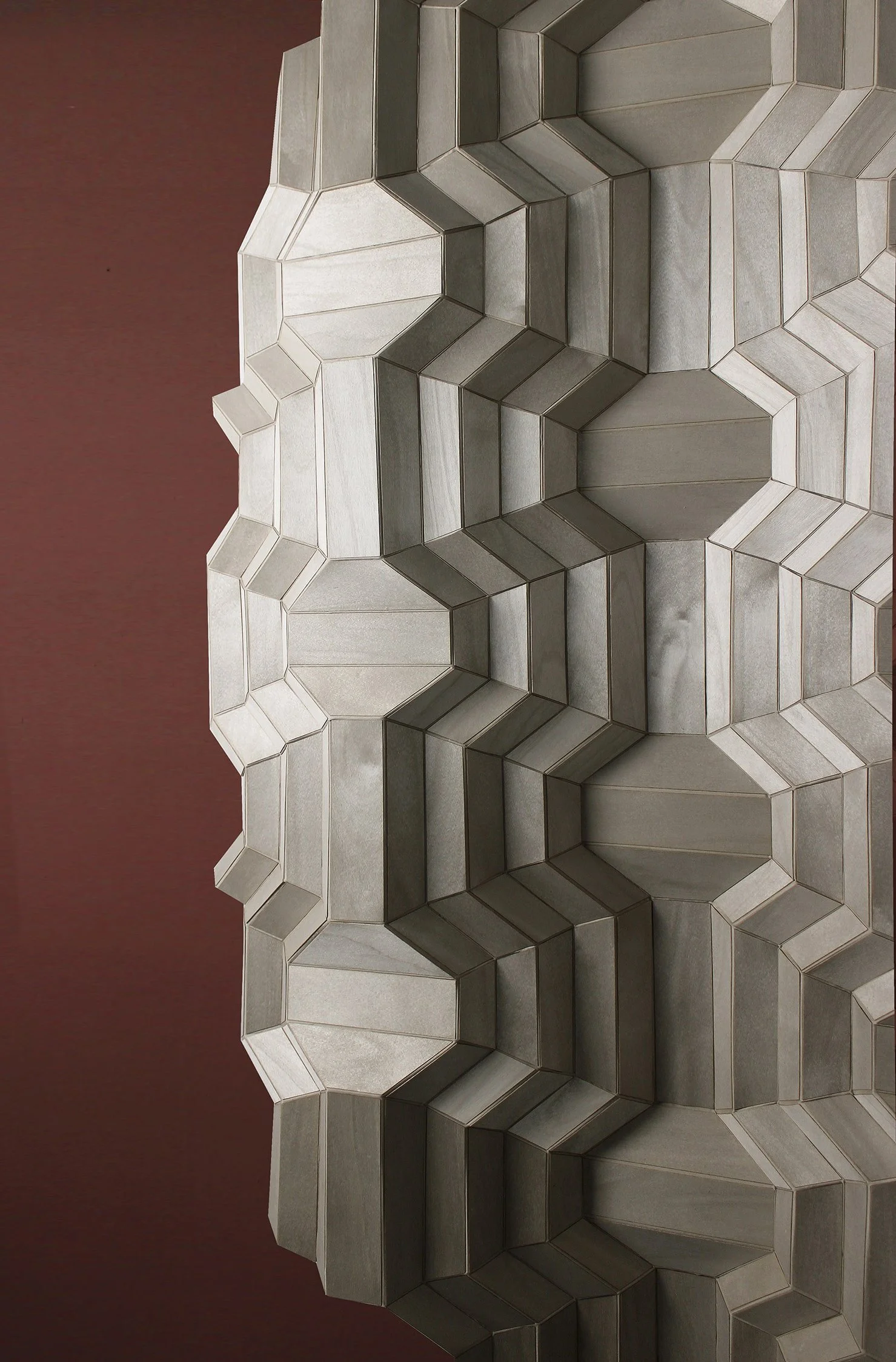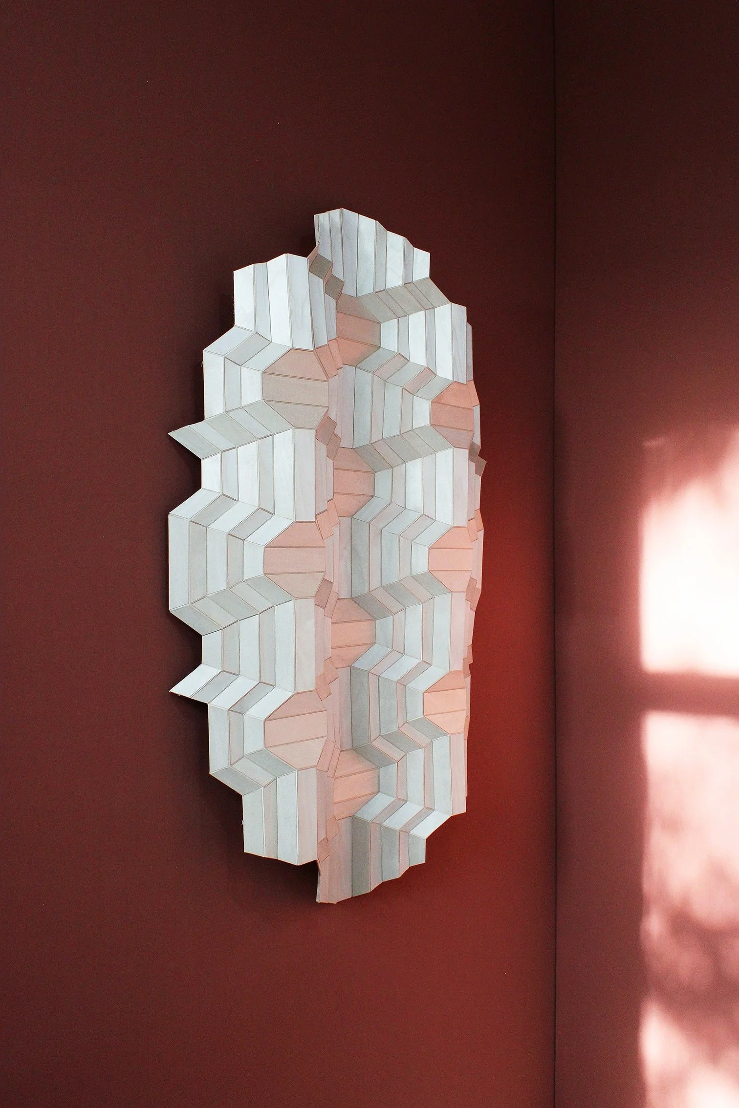 The ORI wall panel is crafted from folded veneer wood, creating a visual reminiscent of origami art. The intricate folds and sharp angles give the piece a dynamic, three-dimensional quality, inviting viewers to explore its layered surface. The natural warmth and grain of the veneer enhance the organic feel of the sculpture, while the precise folding technique adds a sense of craftsmanship and elegance. Perfect as a statement piece, this artwork beautifully combines the artistry of paper folding with the natural beauty of wood, transforming a simple material into a striking and sophisticated wall installation.