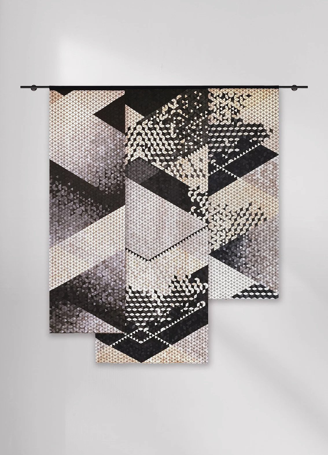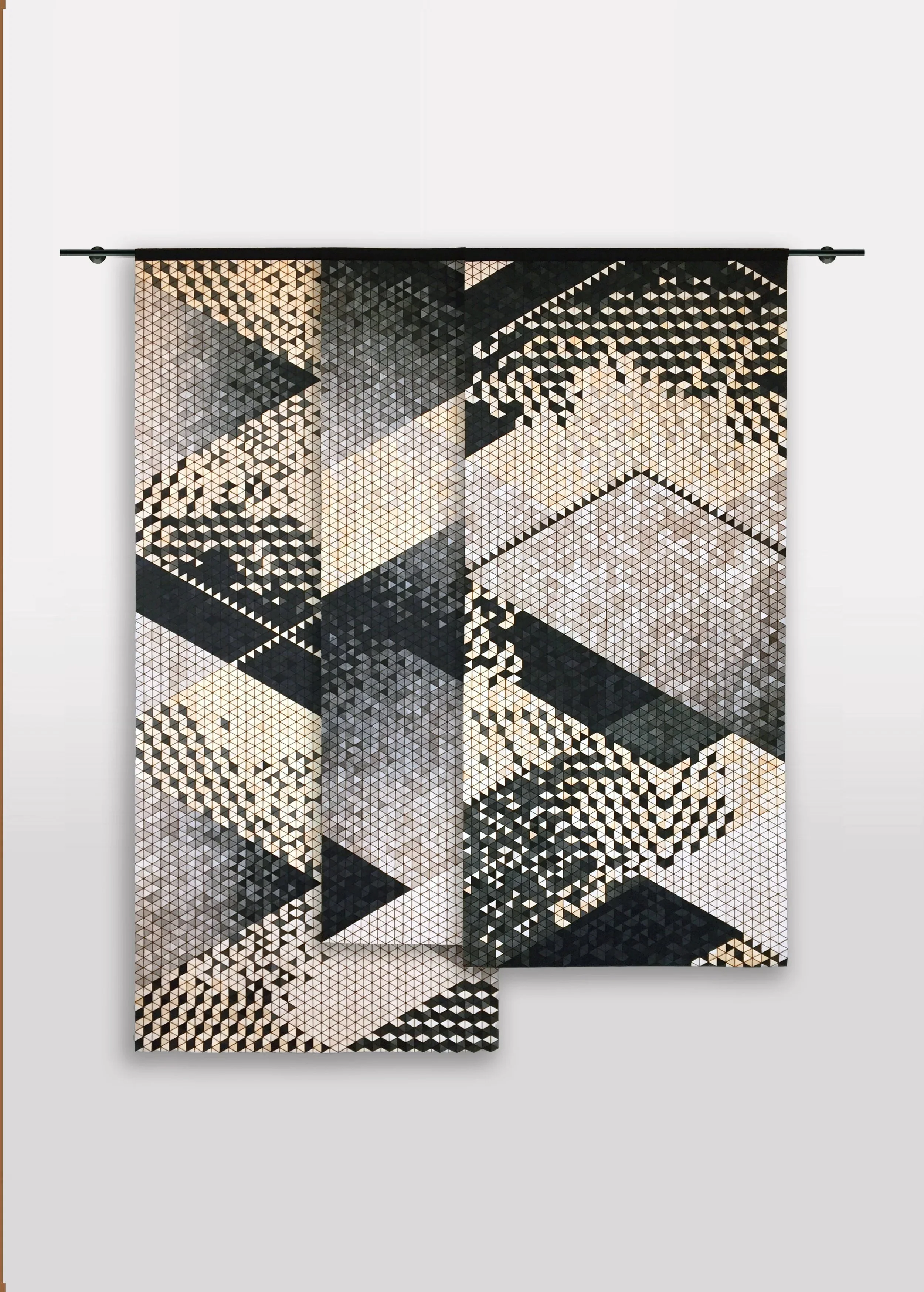 These hand‑crafted wall hangings blend wood and textile into a contemporary take on a traditional tapestry. Hundreds of small wooden elements are assembled like a mosaic, creating rhythmic colour patterns and a richly textured surface. Each piece is individually positioned by hand. The natural variations emerge as a nod to the inherent craftsmanship.
